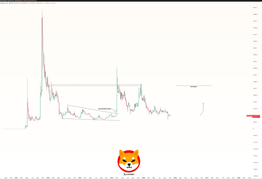 根据分析师贾文·马克斯的技术评论,柴犬该代币似乎已脱离长期积累区,可能即将进入新一轮上涨阶段。该代币于2024年3月首次突破,并一度上涨至0.000046美元附近。2024年12月8日,该代币价格触及约0.00003328美元,随后在2025年大幅下跌。