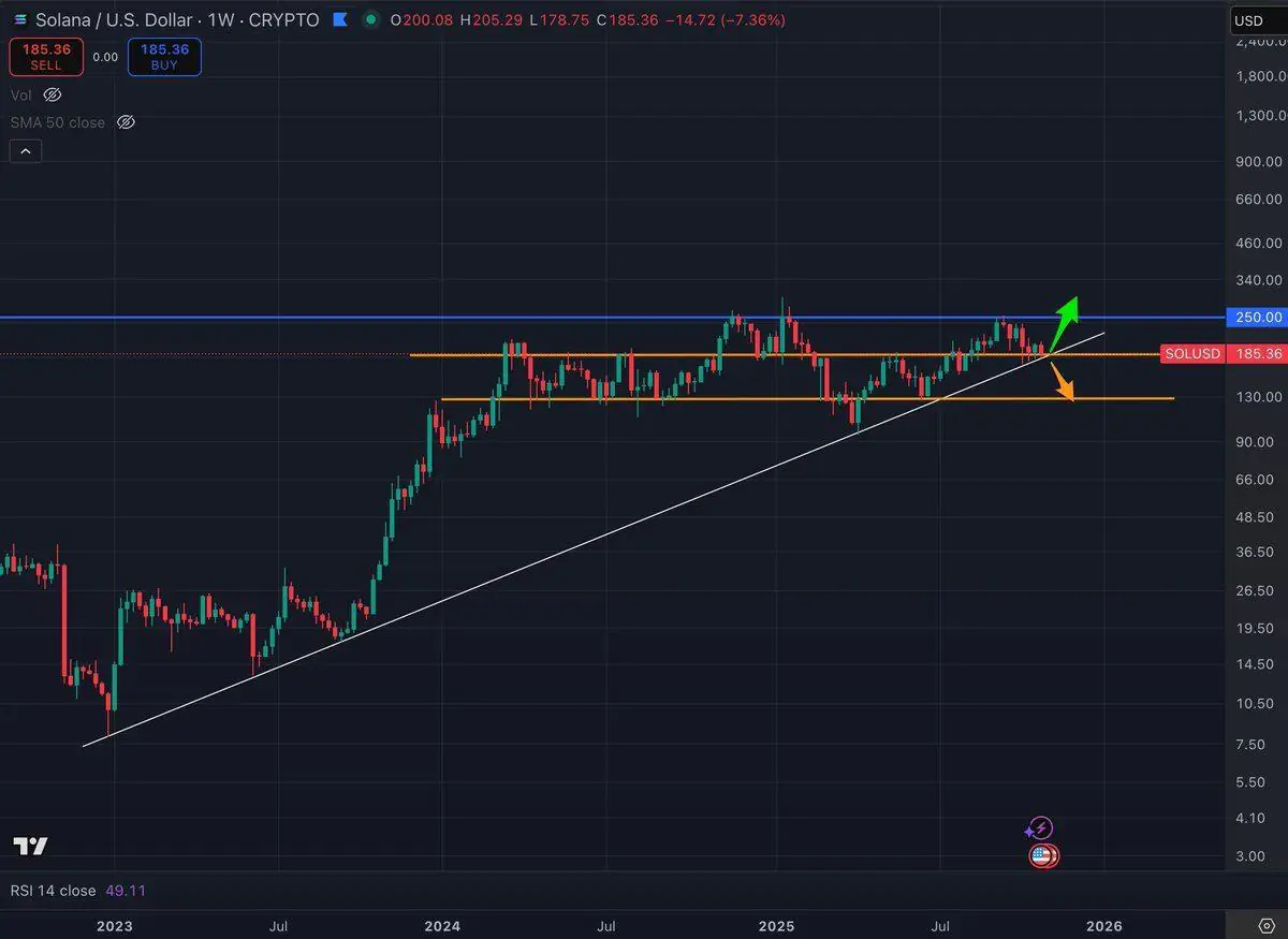 210 美元的价位一直像一道阻力。价格多次尝试突破,但每次都以失败告终。现在,长期趋势线支撑走势正在形成,暗示着潜在的上涨空间。如果这条线能够守住,Solana 的价格可能会开始回升至 300 美元。