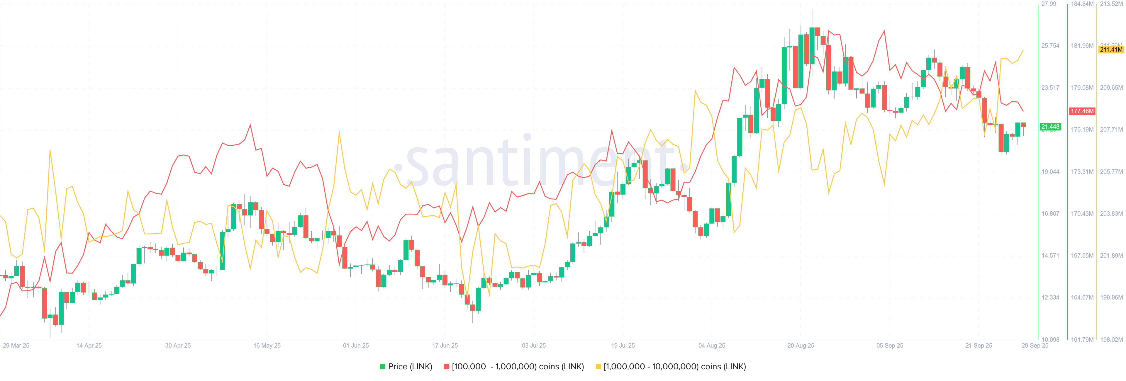该指标显示,持有 100 万至 1000 万个 LINK 代币(黄线)的“鲸鱼”从 9 月 24 日至周二已积累了 370 万个 LINK 代币。同期,持有 10 万至 100 万个 LINK 代币(红线)的钱包则损失了 338 万个 LINK 代币。