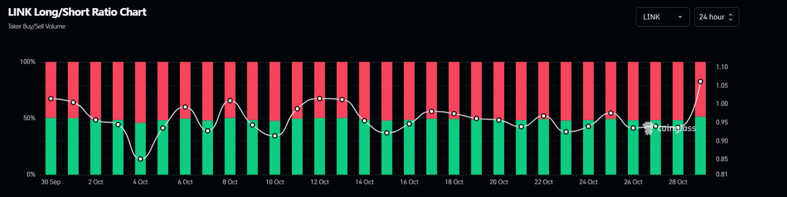 衍生品方面,Coinglass数据显示,LINK的多空比周三达到1.06,创一个月以来新高。该比率高于1表明,更多交易者押注Chainlink价格上涨。
