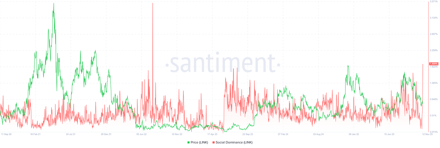Santiment 的 Chainlink 社交主导度指标支持看涨观点。该指数衡量的是与 LINK 相关的讨论在各大平台上的占比。加密货币媒体报道称,Chainlink 的股价已从周六的 0.15% 上涨至周三的 1.89%,创下自 2022 年 7 月以来的最高水平。这一增长表明投资者对 Chainlink 的兴趣日益浓厚,社区参与度也显著提高。