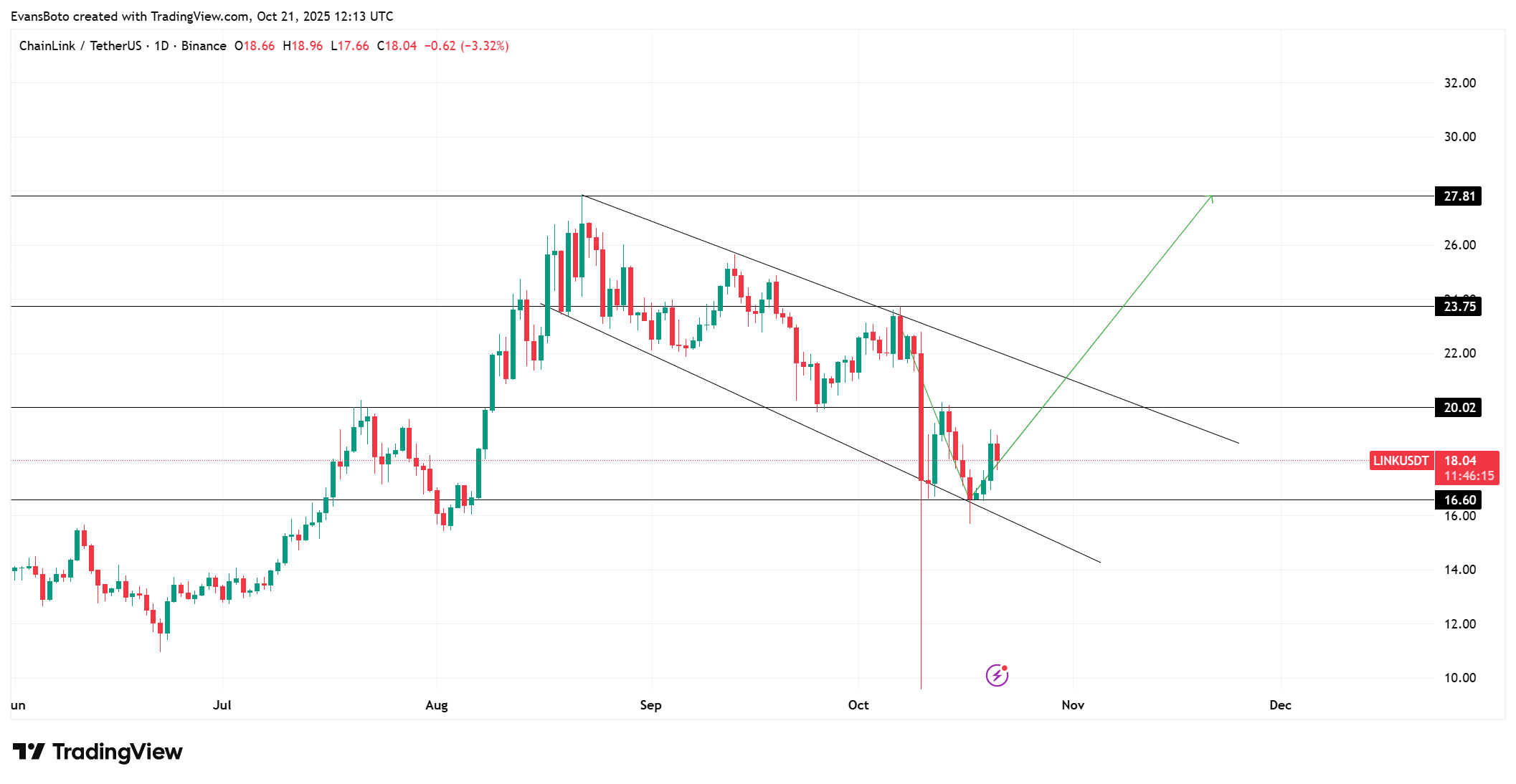 LINK 目前处于下降通道内交易,近期从 16.60 美元附近的下限反弹。