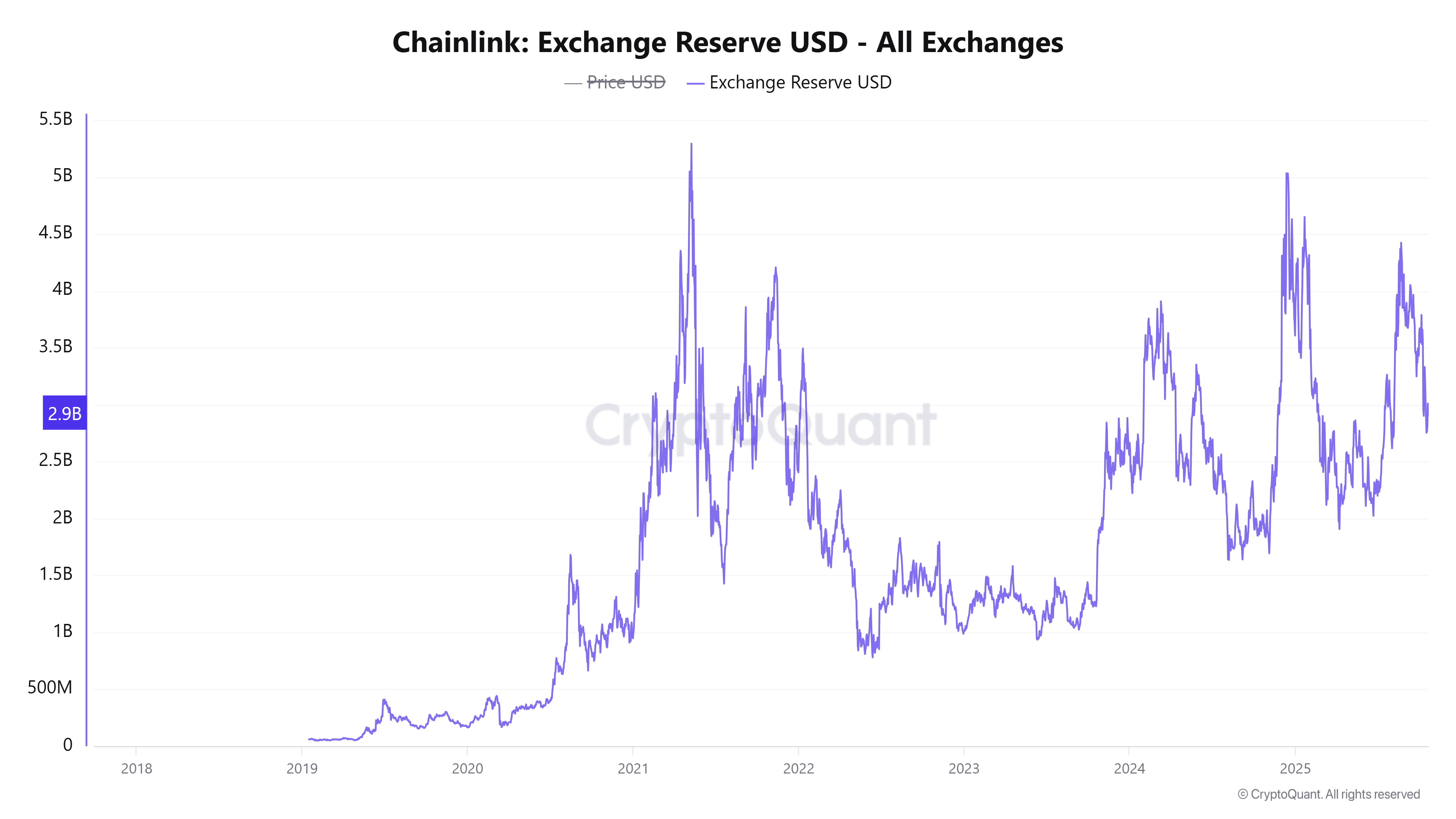Chainlink 的交易所储备下降了 6.18%,降至约 28.8 亿美元,这表明持有者正在将资产转移出交易所。