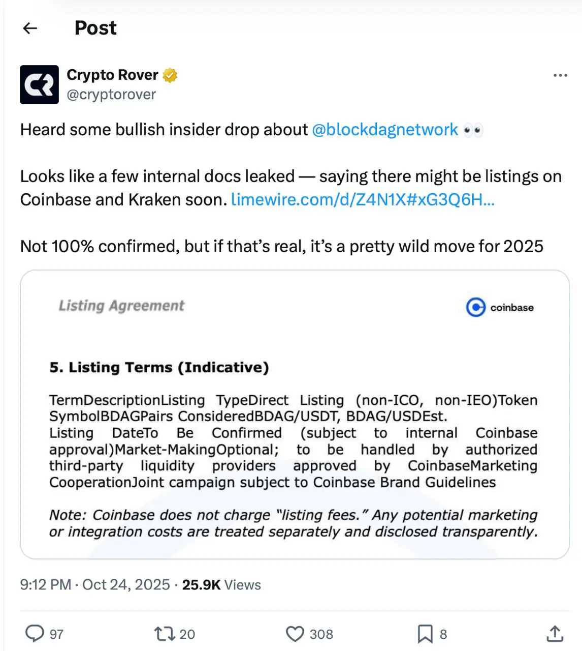 它始于Crypto Rover 的帖子,他分享的截图似乎显示了 BlockDAG 与两大交易所 Coinbase 和 Kraken 之间的内部合作文件。这些文件概述了近 90 万美元用于集成、营销和流动性