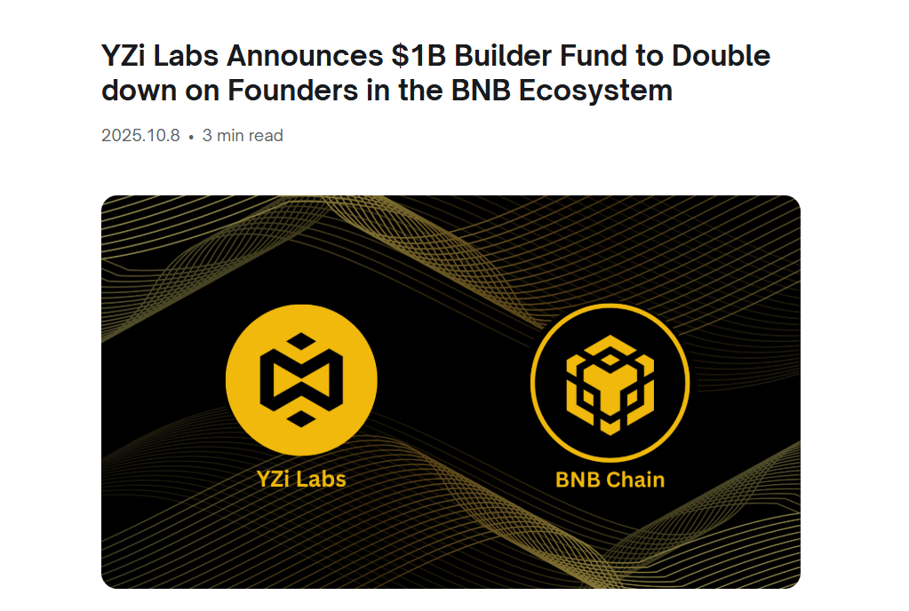 YZi Labs ,一家由币安联合创始人创立的风险投资公司赵长鹏“CZ” , 推出设立规模达 10 亿美元的“建设者基金”,支持 BNB 生态系统的早期创始人。此举正值 BNB 价格飙升至历史高位之际。