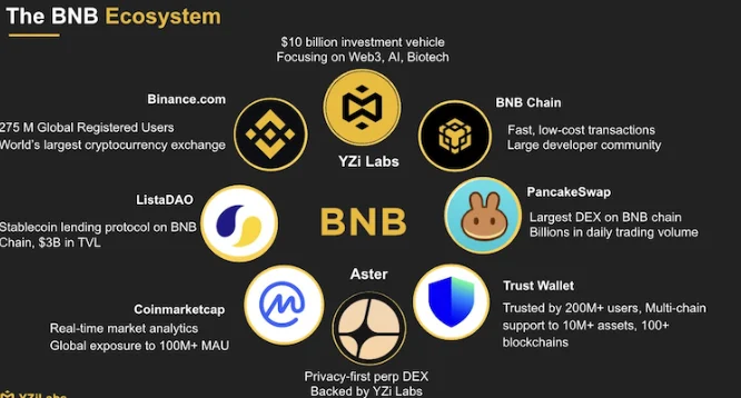 YZi Labs(前身为币安实验室)一直是BNB生态系统中最活跃的投资者之一,通过关键的战略融资推动BNB的增长和普及。YZi Labs此前曾支持过以下项目:煎饼交换 、ListaDAO、基础设施提供商 Aspecta 以及多链 DEX Aster。该公司还通过 BNB 数字资产金库、华兴资本发起的 RWA 基金以及 Hash Global 管理的 BNB 收益基金等举措,帮助扩大机构对 BNB 生态系统的参与。
