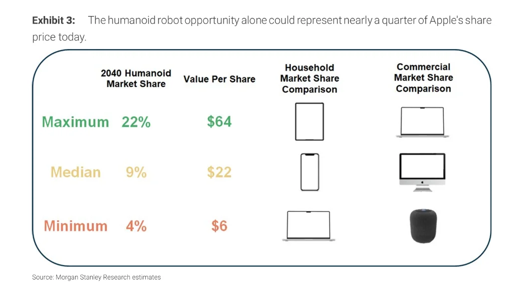 对于一家日均收入超过10亿美元的公司而言,任何新业务都必须足够庞大才能“改变游戏规则”,而机器人市场正是如此。摩根士丹利在报告中对苹果机器人业务的长期财务影响进行了量化分析,其核心观点是,这是一个足以驱动苹果未来估值的重要板块。