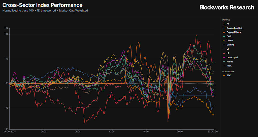 从加密货币板块来看,人工智能板块与股票板块走势一致,当日上涨1.67%。另一个表现突出的板块是风险加权资产(RWA),涨幅接近1%。人工智能指数再次受到TAO的支撑,TAO上涨1.8%;而LINK则提振了RWA板块,上涨1.3%。