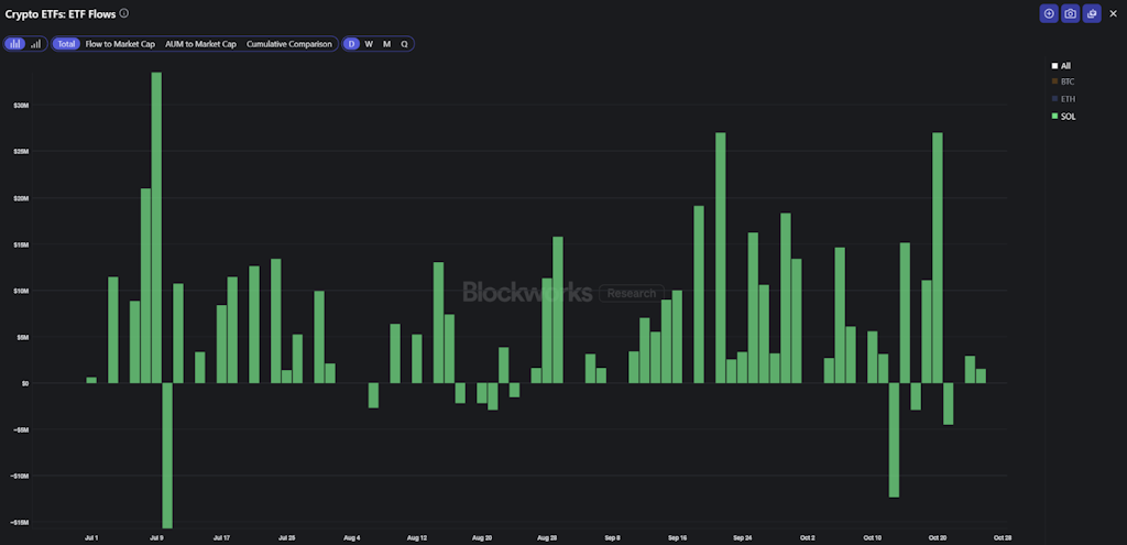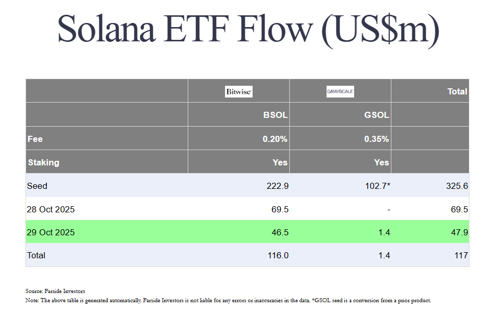 收益取决于资金流向,本周所有人的目光都聚焦在Solana身上。Bitwise BSOL ETF的推出为SOL带来了强劲的上涨动力,短短两天内就吸引了1.16亿美元的资金流入,并产生了显著的收益。1.28亿美元就交易量而言,这使其成为今年表现最强劲的ETF首秀之一。Grayscale的SOL ETF也进入市场,但首日资金流入较为平淡,仅为140万美元。