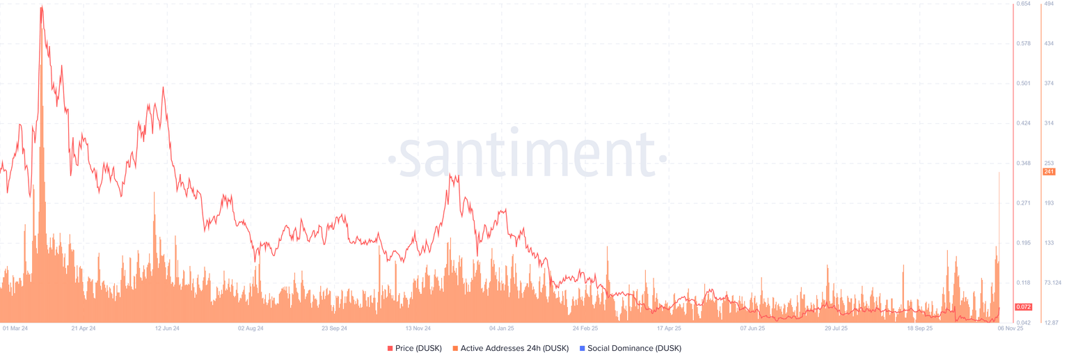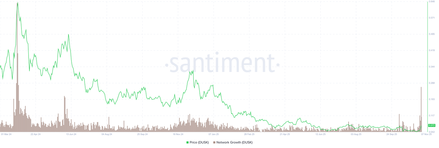 DUSK (DUSK) 股价延续强劲上涨势头,截至周五发稿时交易价格高于 0.078 美元,迄今已累计上涨超过 60%。本星期链上数据显示,每日活跃地址数和网络增长均大幅上升,达到 20 个月以来的最高水平,表明投资者兴趣重燃。与此同时,看涨的技术指标表明,DUSK 有望再度上涨,目标价位可能达到 0.10 美元。