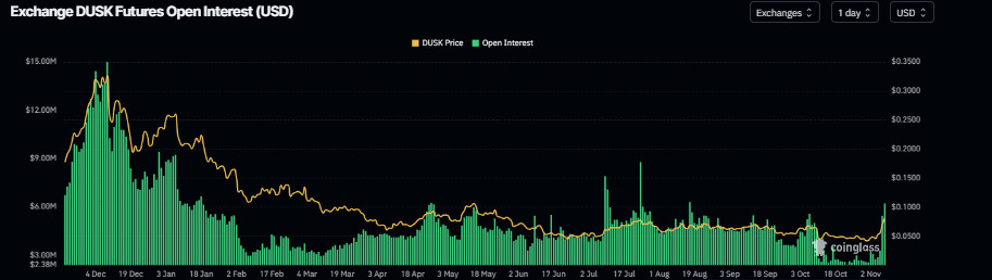 然而,在审视其衍生品数据时,前景DUSK 的走势预示着未来可能进一步上涨。CoinGlass 的数据显示,DUSK 期货在交易所的未平仓合约 (OI) 从周一的 277 万美元升至周五的 621 万美元,创下 8 月 18 日以来的最高水平。OI 的上升意味着有新的资金或额外的资金进入市场,从而推动了 DUSK 目前的上涨行情。