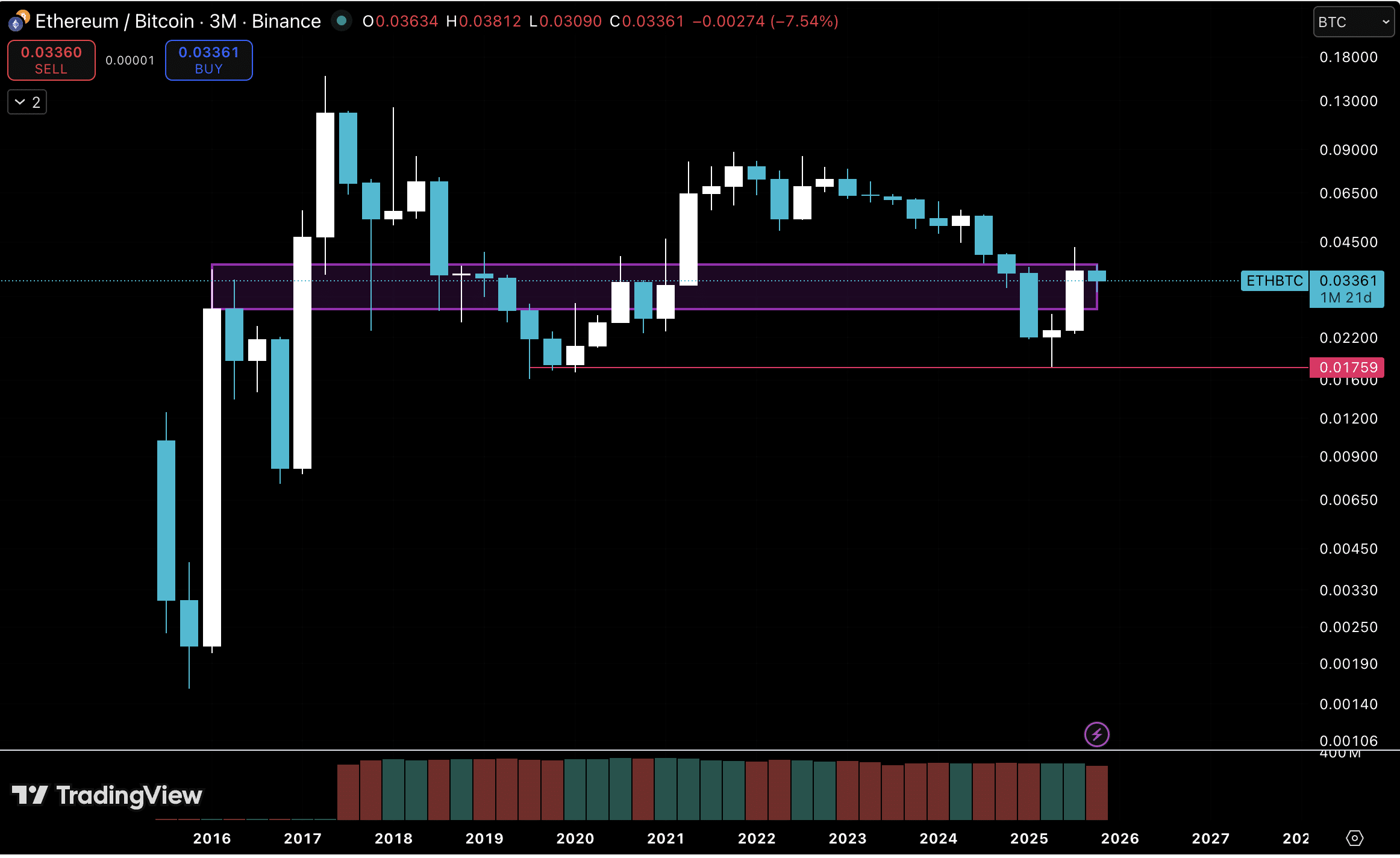 让我们从以太坊与比特币的三个月走势图开始分析。我们可以看到,以太坊上涨时往往爆发力十足,且持续时间短于下跌周期。这张已有九年历史的图表数据有限,参考K线数量不多。值得关注的是,以太坊在0.01759价位附近反弹,形成了一个晨星形态,这是一个看涨信号,预示着价格可能反转。这意味着以太坊的表现将优于比特币——也就是所谓的“山寨币季”。