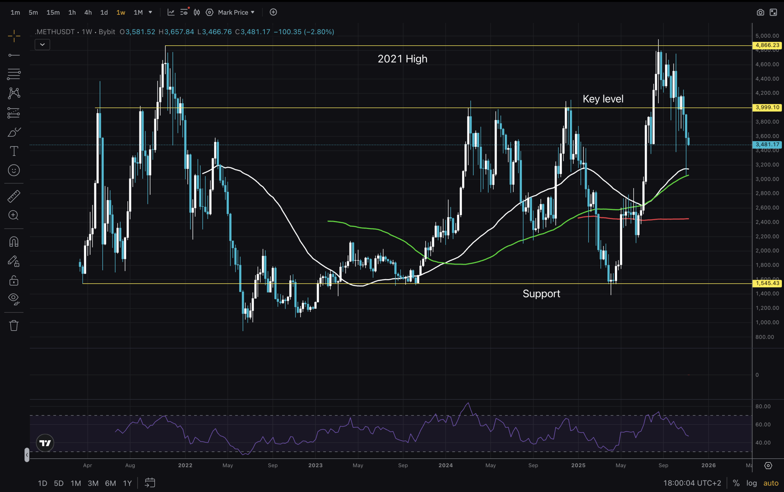 接下来,我们来看一下ETH/USD货币对的周线图。价格仍在支撑位和2021年高点附近,正朝着回撤完成的方向发展。价格高于所有移动平均线,且RSI指标也已重置,这两个指标都预示着下一轮上涨行情的良好前景。由于突破4000美元关键水平后创出新高,我们目前处于多位点支撑位(MSB)状态。看起来更高的低点正在形成中。