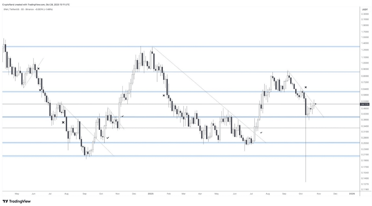 在三日图表上,ENA 从 0.42 美元至 0.46 美元的需求区域反弹,该区域此前曾引发短暂的复苏。