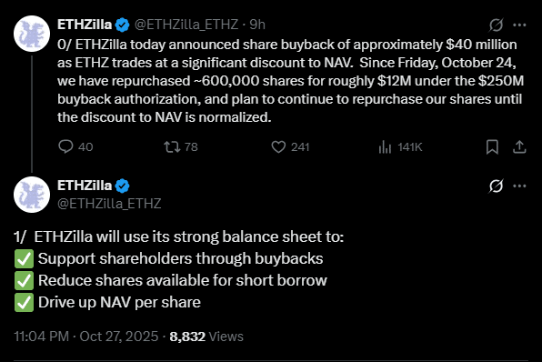 第七大以太坊[ETH]DAT(数字资产库)公司 ETHZilla Corporation(ETHZ),宣布它出售了价值 4000 万美元的 ETH 来资助股票回购。