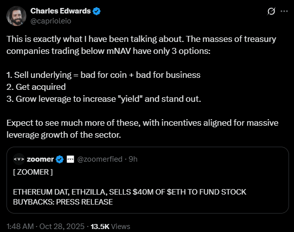 ETHZilla 首席执行官 McAndrew Rudisill 表示,此举将有助于减少股权稀释并支撑 mNAV。