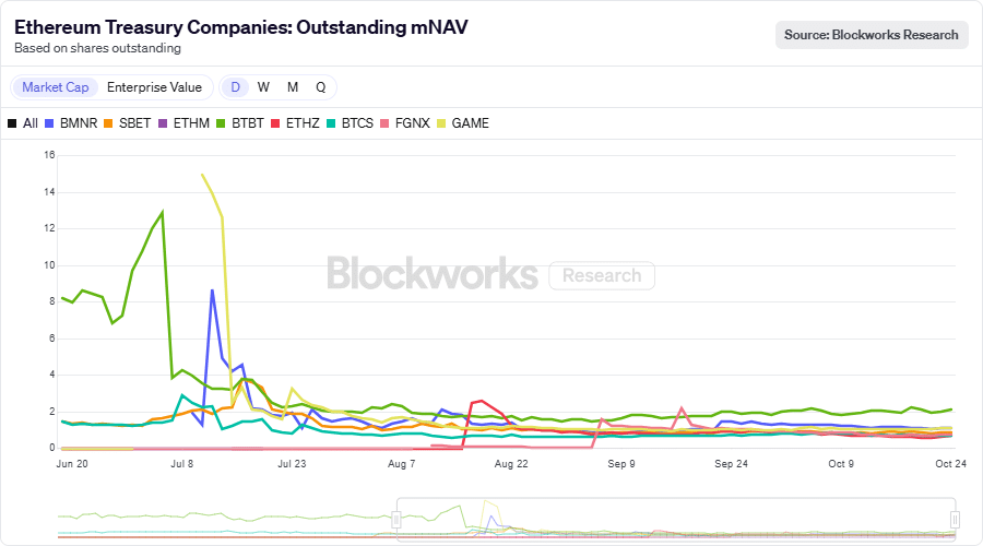如果 ETH 以溢价交易,mNAV 或市值与净资产价值比率允许 DAT 筹集资金并购买更多 ETH。
