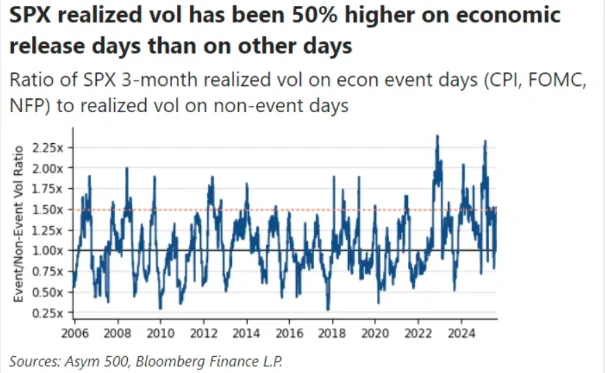 Asym 500数据显示,过去三个月内,标普500指数在CPI、月度就业数据及美联储利率决议发布日的平均波动率,较其他交易日高出近50%。