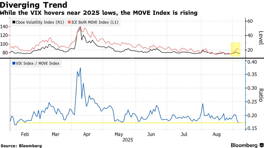 衡量标普500预期波动率的VIX指数目前徘徊在年内最低点附近。与此同时,债券市场的波动率指标——ICE美银MOVE指数在上周二和上周三累计上涨了10点,创下自4月关税风波高峰期以来最大两日涨幅,这表明债券市场正为即将到来的波动性上升做准备。