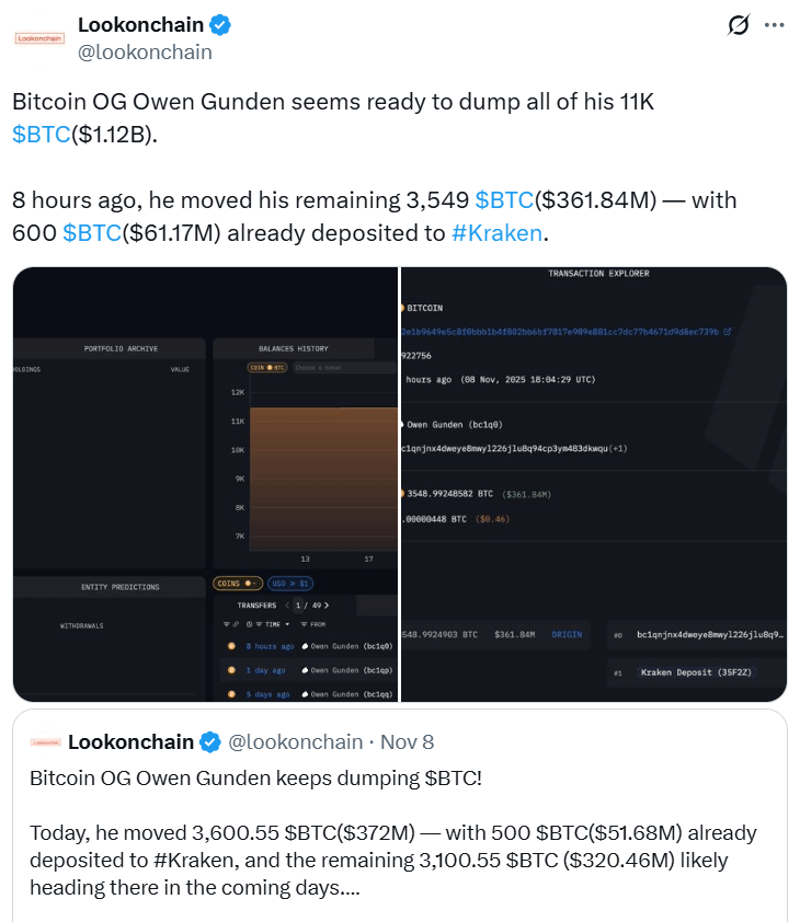 据 Lookonchain 报道,早期比特币(BTC 106,483 美元)套利交易员 Owen Gunden 是最新一批将其 11,000 枚比特币持有量转移到交易所的人之一,他于周日完成了最后一次 3,549 枚比特币的转移。