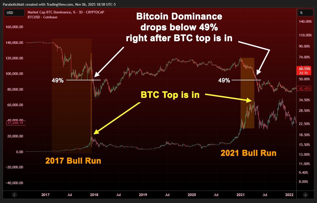 Collin Talks Crypto 扩展根据这一理论,市场牛市的最后阶段通常以比特币价格上涨而 BTC.D 同时下跌为特征,即山寨币季,正如 2017 年和 2021 年所见。