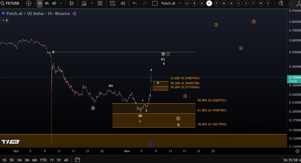 如果支撑区域守住,多头再次出现,我们可能会看到第五浪启动,推动 Fetch.AI 进一步上涨,完成整个形态。如果价格下跌幅度超出预期,0.22 美元至 0.19 美元附近仍有安全区域,但就目前而言,市场格局看起来不错。