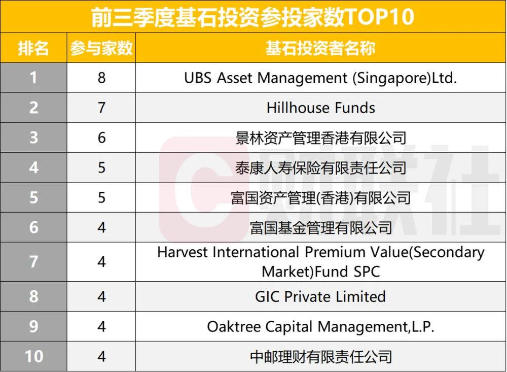 从年内前三季度各家基石投资者参投具体家数来看,港股IPO基石投资者参与情况呈现两大特点: