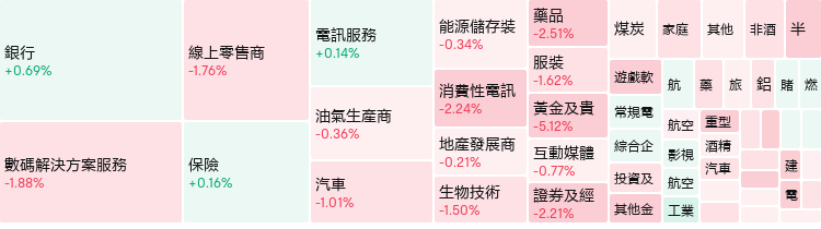板块方面,科网股纷纷下行,网易-S跌2.35%,美团-W跌1.96%,小米集团-W跌1.92%,腾讯控股跌1.68%,阿里巴巴-W跌1.50%,百度集团-SW跌0.96%。