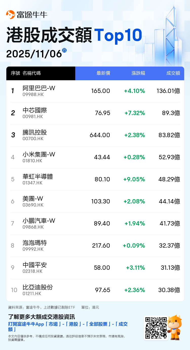 个股方面,$阿里巴巴-W (09988.HK)$涨超4%,淘宝闪购新客双11电商订单破亿。