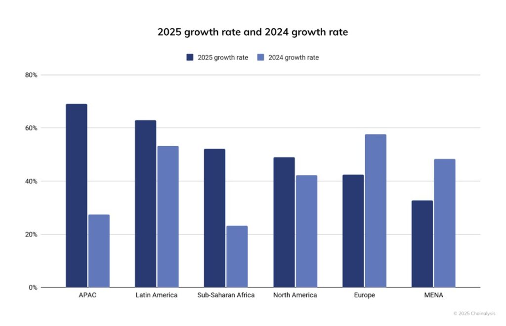 全球区块链交易量和用户采用率正在激增。Chainalysis 的一份报告显示,截至 2025 年 6 月的 12 个月中,亚太地区(增长最快的地区)的链上加密货币交易活动同比增长 69%,交易量从 1.4 万亿美元跃升至 2.36 万亿美元。