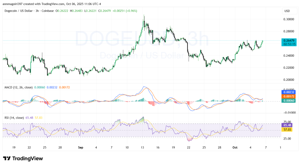 狗狗币目前交易价为 0.26479 美元,上涨 0.96%。MACD 指标位于 0.00060,低于信号线 0.00172,这意味着看涨趋势正在放缓。柱状图呈平缓趋势,表明买方力量正在减弱,并可能改变趋势方向。RSI 指标为 65.48,接近超买,这是下跌前的负面信号。RSI 指标的负向变动表明看涨力量迟缓,这意味着该指数并未以强劲的势头向最新价格移动。