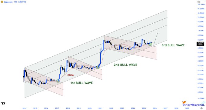 截至 2025 年 10 月,狗狗币的交易价格约为 0.20 美元,徘徊在通道下边界附近,其积累区类似于前几波浪潮的早期阶段。