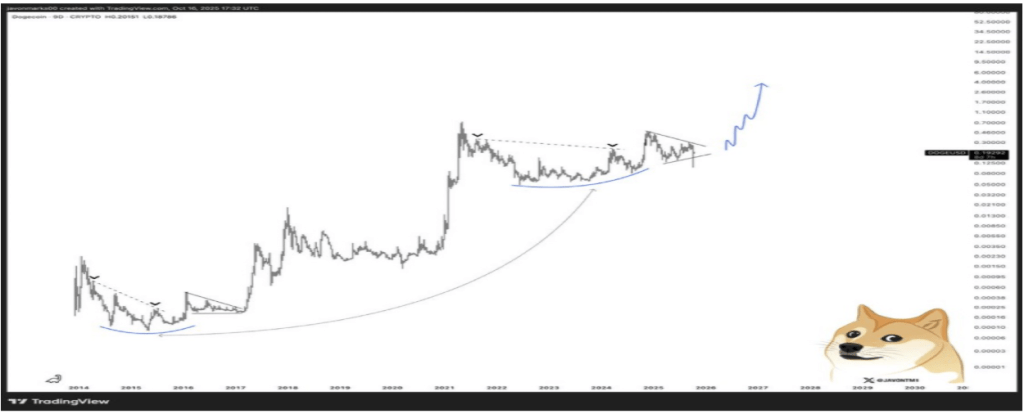 马克斯指出,狗狗币的长期结构正在形成一个巨大的杯状底部,历史上,这曾为大幅牛市铺平道路。他的分析预测,如果历史模式像过去那样发展,狗狗币近期至少会上涨251%,在更长的时间内,甚至可能上涨2000%。