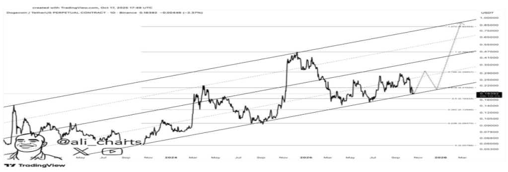 马丁内斯在分析中,根据斐波那契回撤位和延伸位,确定了0.29美元、0.45美元和0.86美元这几个温和但关键的上行关口。他的图表显示了狗狗币如何反复从通道下边界反弹,大多在0.18美元附近,这表明买家兴趣浓厚在该区域。值得注意的是,分析师预测,从该区域反弹可能为未来几个月逐步升至 1 美元奠定基础。