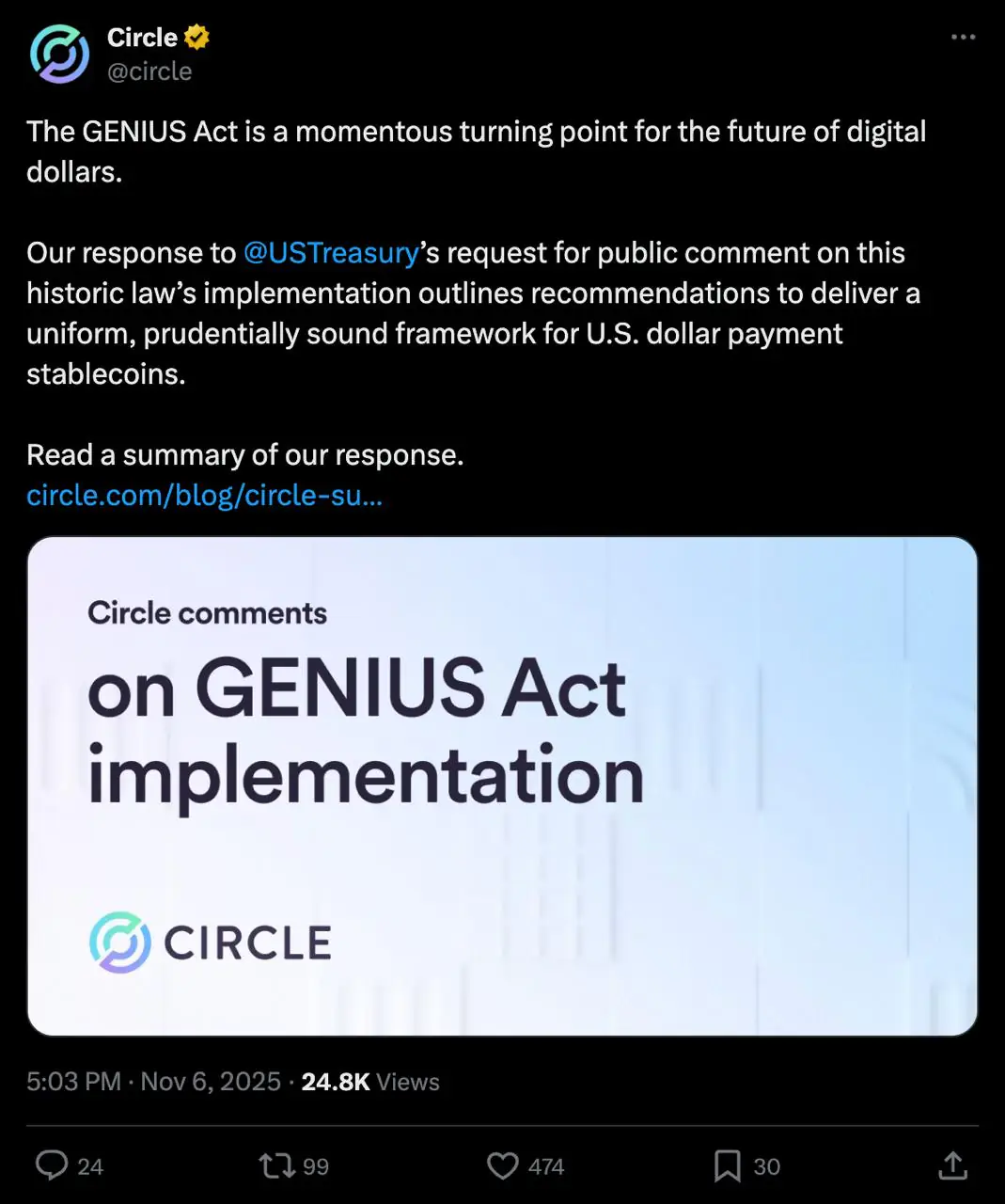 Circle提交的材料是第二轮公众意见征询的一部分。天才法案该法案预计将在最终法规获批后的18个月或120天内生效。这项由特朗普总统于7月签署的法律,标志着美国稳定币监管的一个转折点。