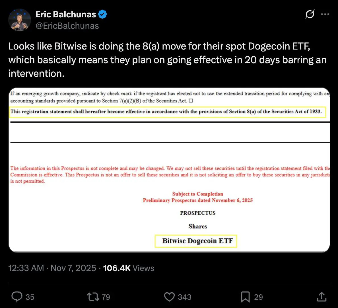 狗狗币出现反弹迹象,持稳高于 0.1700 美元11月7日,随着ETF传闻重现,市场势头正在增强。彭博社报道。埃里克·巴尔丘纳斯Bitwise表示,如果美国证券交易委员会不阻止,Bitwise狗狗币现货ETF可能在不到20天内推出。这一消息迅速改变了市场情绪。