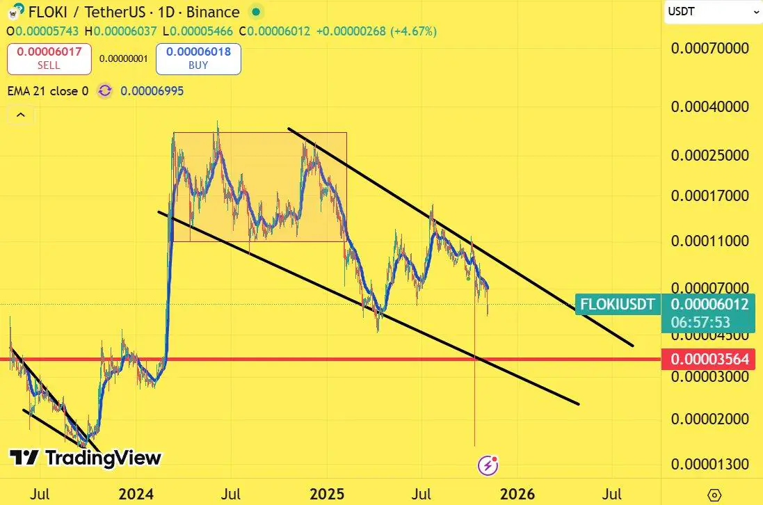 弗洛基盘绕在……下降通道该股目前徘徊在 0.000059 美元附近,并在 11 月 7 日守住了关键支撑位。空头正在放缓,图表开始显示出可能反转的迹象。
