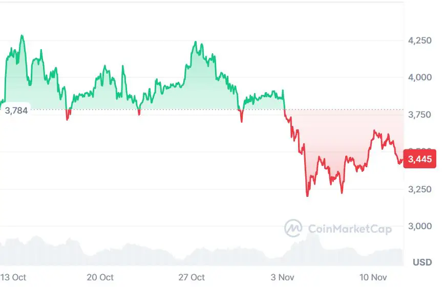 CoinMarketCap数据显示,11月11日以太坊价格徘徊在3400美元附近。然而,截至同日,以太坊占比为……2010亿美元占所有区块链上总计 3140 亿美元代币化资产的 3140 亿美元。这意味着,尽管它作为结算层占据主导地位,但最大的山寨币