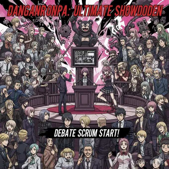 Prompt:Danganronpa court with all characters, cinematic official art