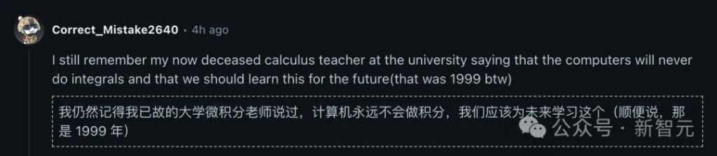 这让Correct_Mistake2640顿生出一种「活久见」的历史感,他还记得1999年他读大学时,微积分老师告诉他,计算机永远不会做积分,所以为了未来应该学习积分。
