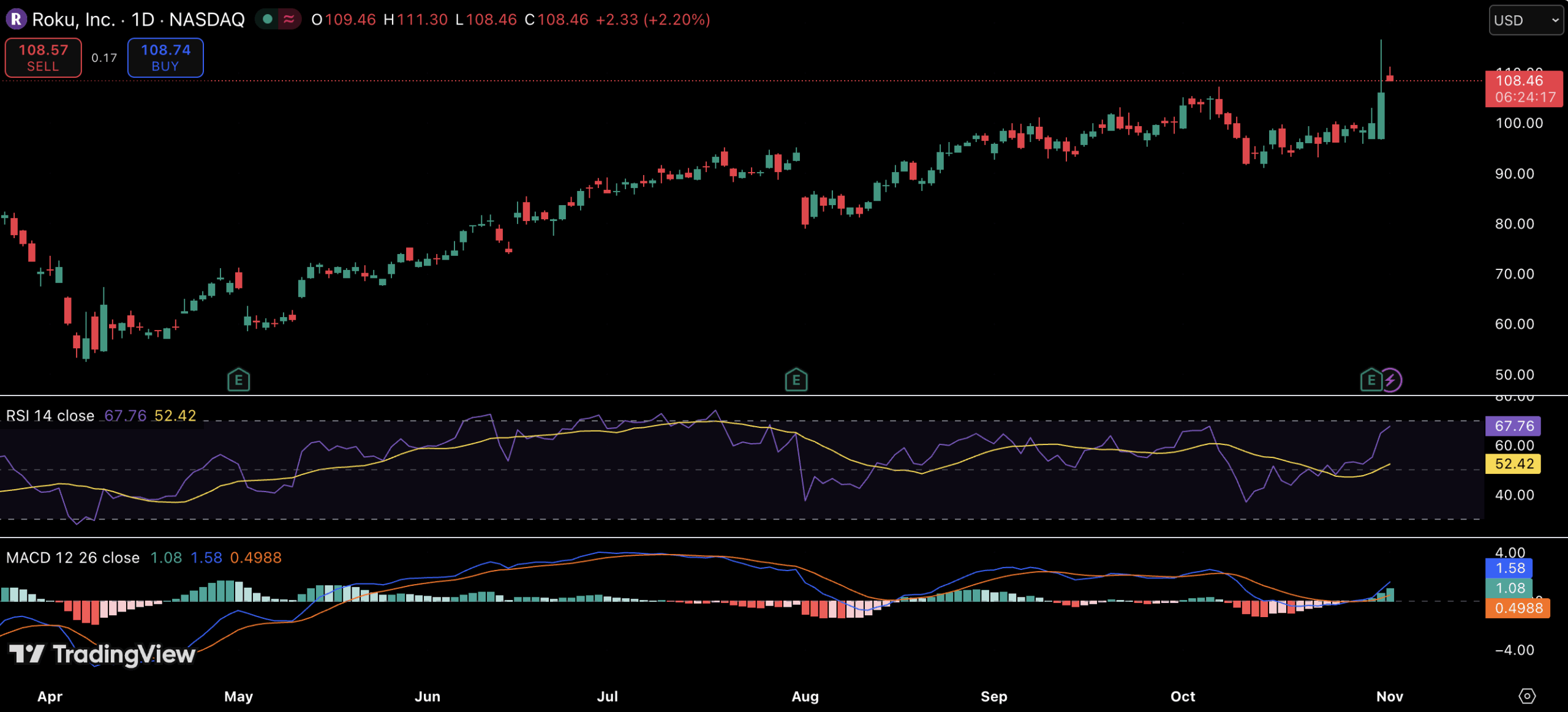 从技术层面来看,Roku似乎正进入早期突破阶段,动量指标发出看涨信号。与此同时,Roblox的RSI指标已接近超卖区域,MACD指标仍为负值,表明未来可能出现盘整。