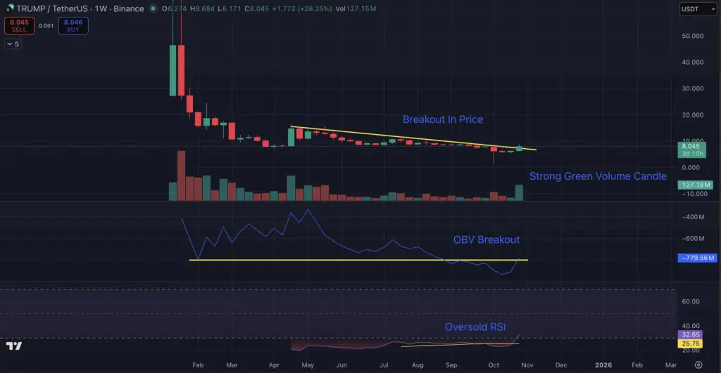“>ATH当时的价格是13美元。但自那以后,该代币价格暴跌。下跌98.4%10 月 31 日的价格为 0.119 美元。近几周交易量一直非常低迷,社群似乎也已消失。MELANIA要想有任何复苏的可能,首先特朗普的股价需要重回上涨趋势,才能重新激发人们对特朗普家族相关梗币的看涨情绪。