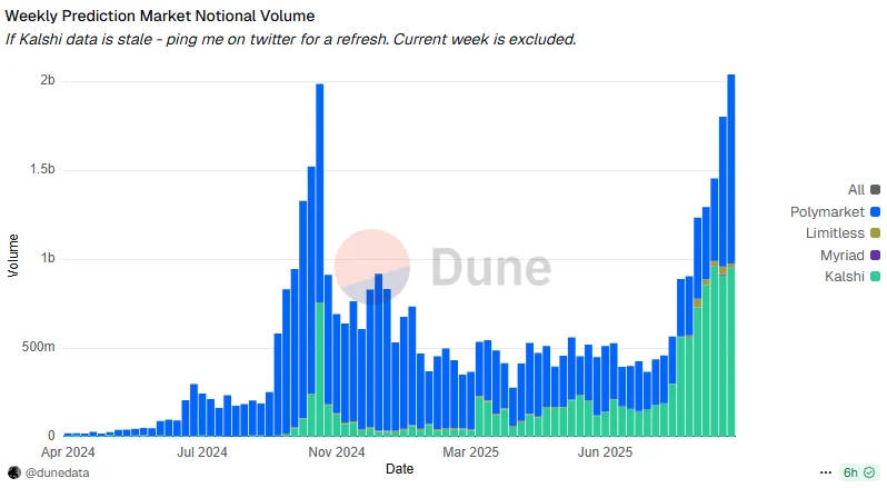 根据Dune Analytics汇总的公开数据,截至10月19日当周,Kalshi与Polymarket的名义交易量首次突破20亿美元,超过去年大选期间的疯狂交易水平——当时这两家平台首次被主流金融界关注。
