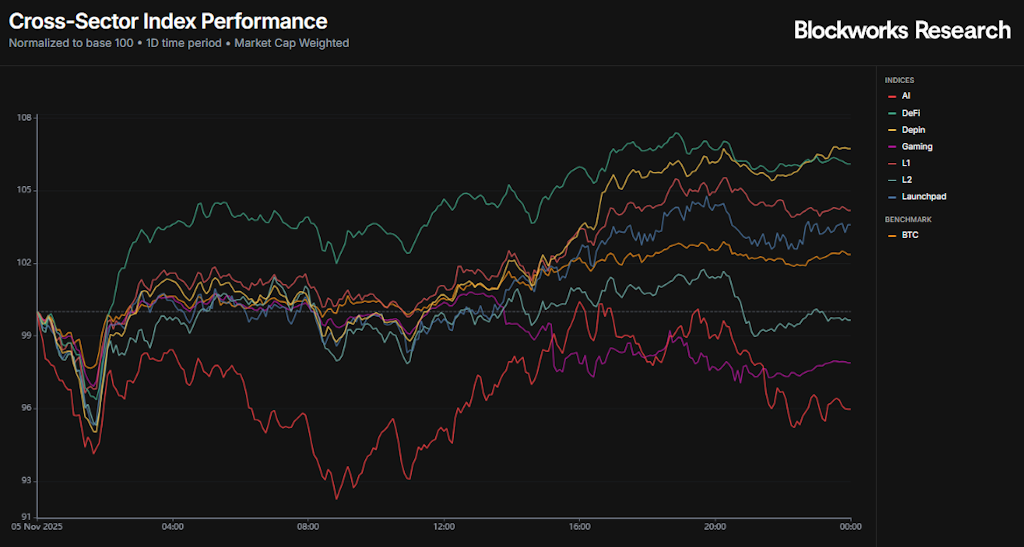 人工智能板块表现最差,尽管过去一个月涨幅强劲,但仍下跌了4%。此次回调可能反映出资金正转向近期调整中超卖的板块。人工智能指数内部表现不一。ICP当日飙升14.6%,而IP和TAO是仅有的两只下跌的成分股,均下跌约4%。