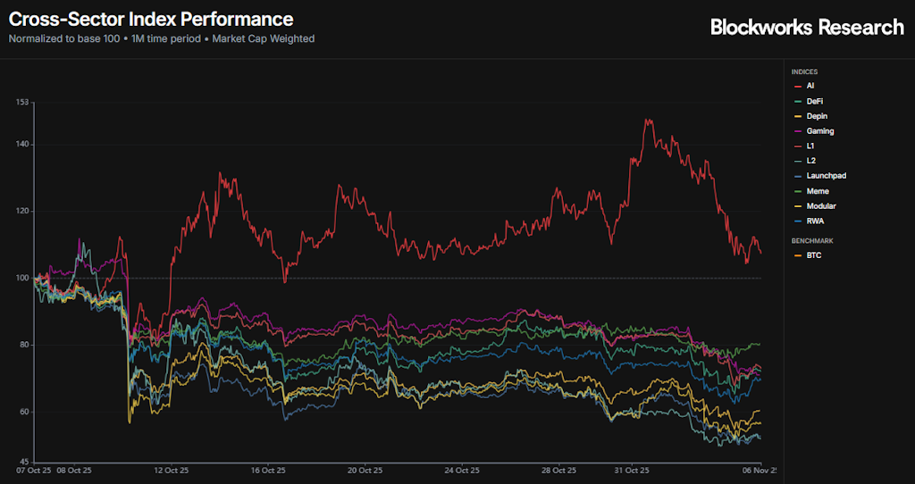 人工智能板块表现尤为突出,上涨了7.3%——不仅自10月10日回调以来如此,而且在近期的市场疲软期间也保持了增长。ICP(上涨31.8%)和VIRTUALS(上涨18.5%)等代币的上涨起到了一定作用,但该板块的大部分上涨势头仍然来自TAO,TAO在指数中占比三分之一,本月上涨了10.8%。