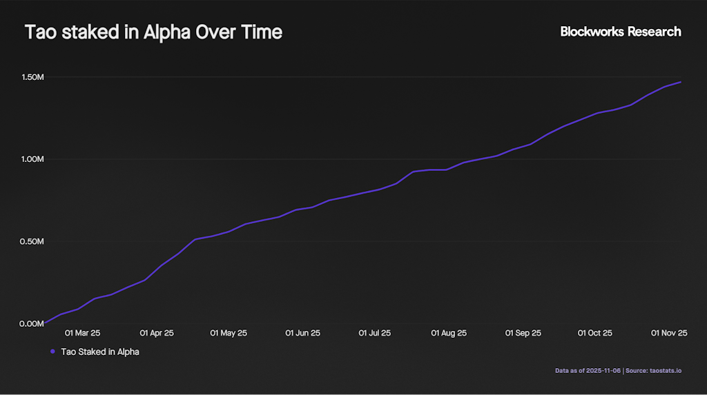 Alpha 中质押的 TAO 数量持续攀升,表明对子网代币的需求不断增长。