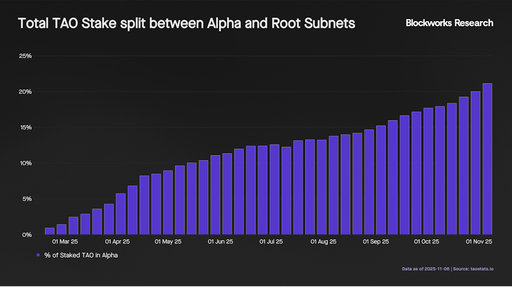 Alpha 子网和 Root 子网之间的权益分割比例也持续增长,从 7 月份的 13.2% 增长到目前的 21.1%,这表明人们对 Bittensor 子网的兴趣日益浓厚。