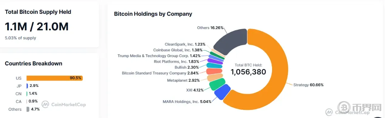 目前上市公司持有比特币总供应量超5%,数据来源:CoinMarketCap
