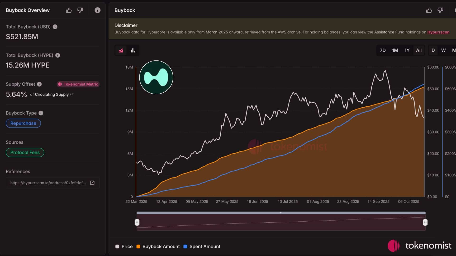 根据 Tokenomist 的数据,HYPE 回购机制自推出以来已累计回购价值超过 5.22 亿美元的代币,占流通供应量的 5.6% 以上。