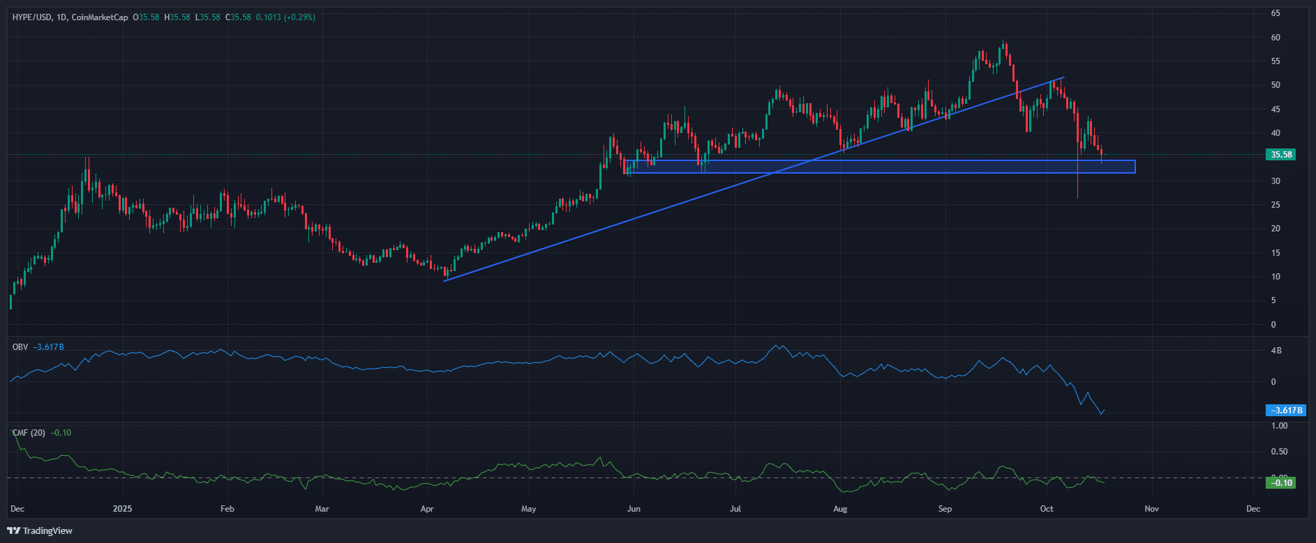 图表显示,HYPE 已跌破关键趋势线支撑位,且高点和低点均不断走低。这表明价格结构看跌。